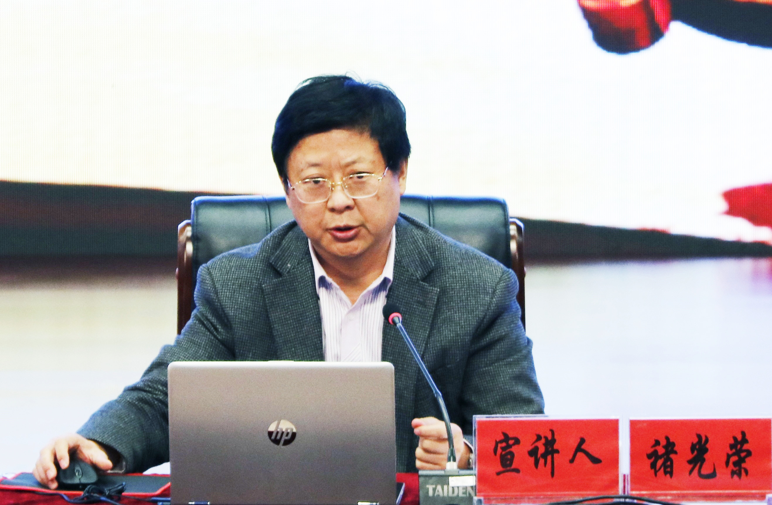 褚光荣书记通过一则短片,和大家一起重温十九大的盛况。他从全面准确学习领会党的十九大精神;深刻学习领会习近平总书记在贵州省代表团重要讲话精神;坚持后发赶超,突出内涵发展,展示贵州高等教育新作为等三个方面深入宣讲。