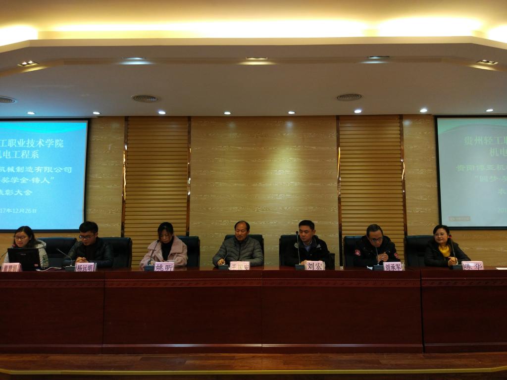12月26日,贵州轻工职业技术学院—贵阳博亚机械制造有限公司“圆梦·铸人·匠心”奖学金表彰大会在学生事务中心报告厅隆重举行,本次大会表彰了圆梦助学金一等奖10人,二等奖20人,三等奖69人;铸人基金8人;匠心基金二等奖11人,三等奖5人,特等奖5人。贵阳博亚机械制造有限公司总经理刘宏、机电工程系主任王国安老师、贵阳博亚机械制造有限公司生产部经理刘承军、系副主任姚昕老师、系学生管理科长董慧娟老师、系团总支书记杨远明老师、系教学管理科长陈华老师、艾政华老师、陈菲菲老师以及机电工程系16级受表彰的学生代表200余人应邀出席了本次表彰大会。