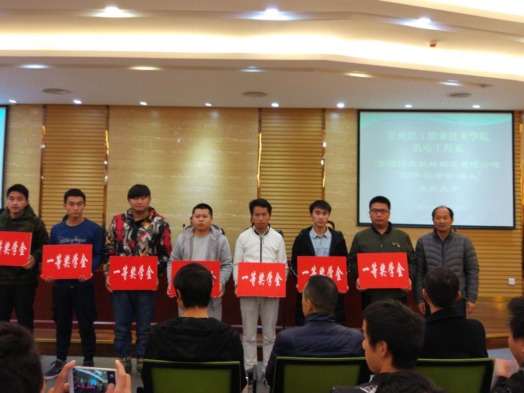 在同学们热烈的掌声中,贵阳博亚机械制造有限公司总经理刘宏宣读了《贵州轻工职业技术学院—贵阳博亚机械制造有限公司关于对杨仁勇等128名同学进行表彰的决定》,宣读完毕后,由团总支书记杨远明老师、贵阳博亚机械制造有限公司生产部经理刘承军、系主任王国安老师、副主任姚昕老师、陈华老师、贵阳博亚机械制造有限公司总经理刘宏,分别对铸人基金、圆梦奖学金一等奖、二等奖、三等奖和匠心基金的128名同学进行颁奖。
