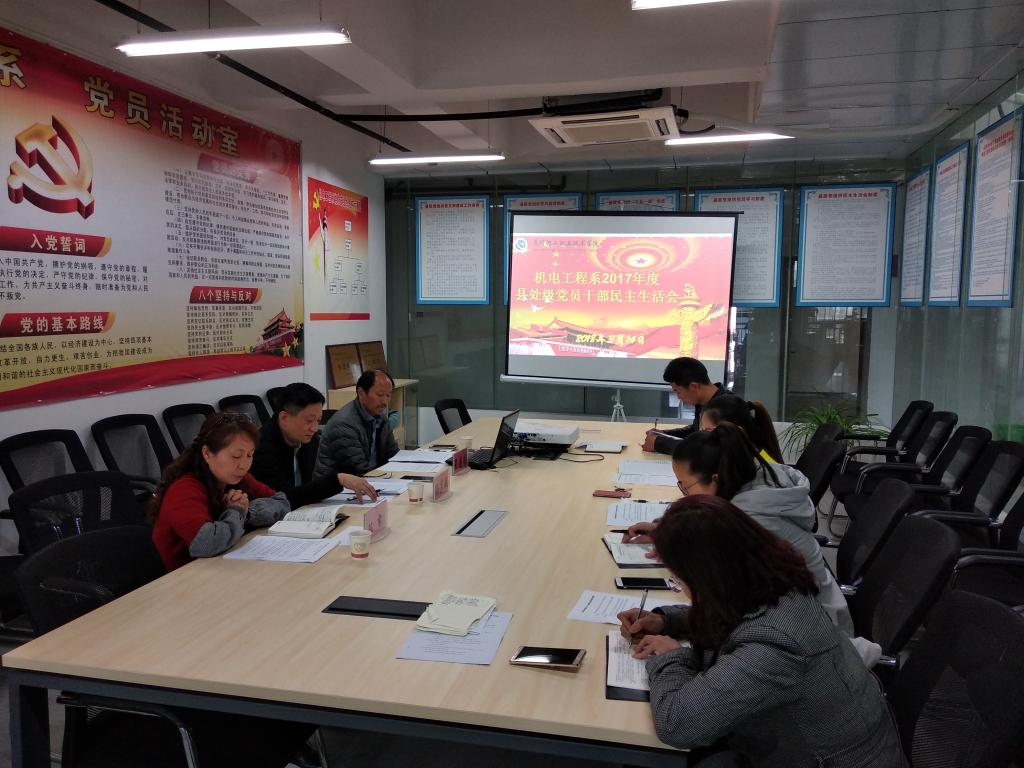 按学院下发文件通知要求及会议议程,首先,机电工程系党总支书记陈霁通报会前准备情况、征求意见和谈心谈话情况。接着,陈霁书记通报总支2016年度民主生活会领导班子问题整改落实情况,并代表系部党政领导班子作对照检查。随后,系部党政领导班子成员依次作个人对照检查发言,开展了批评和自我批评,被批评同志作了表态发言。学院党委副书记冯其毅对机电工程系2017年度县处级党员干部民主生活会作点评。最后,机电工程系主任王国安代表党政领导班子作表态发言和总结。