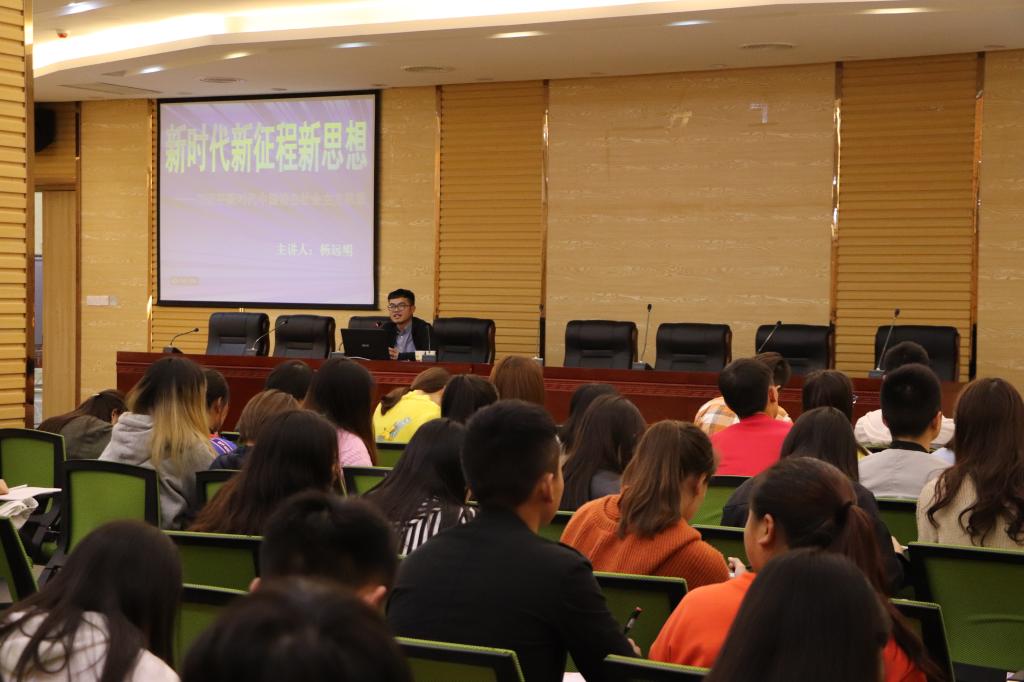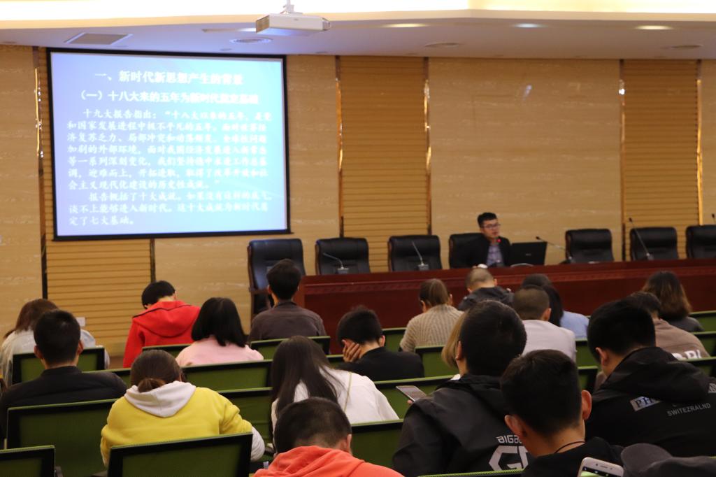 杨老师首先带领学生一起学习了十九大报告,指出十九大报告的主线主题和核心灵魂。其次杨老师为大家介绍了习近平新时代中国特色社会主义思想产生的背景、丰富内涵。在授课中,杨老师带领大家学习了十九大报告中所提出的新时代的五大内涵,即新时代是承前启后、继往开来、在新的历史条件下继续夺取中国特色社会主义伟大胜利的时代;新时代是决胜全面建成小康社会、进而全面建设社会主义现代化强国的时代;新时代是全国各族人民团结奋斗、不断创造美好生活、逐步实现全体人民共同富裕的时代;新时代是全体中华儿女勠力同心、奋力实现中华民族伟大复兴中国梦的时代;新时代是我国日益走近世界舞台中央、不断为人类作出更大贡献的时代。