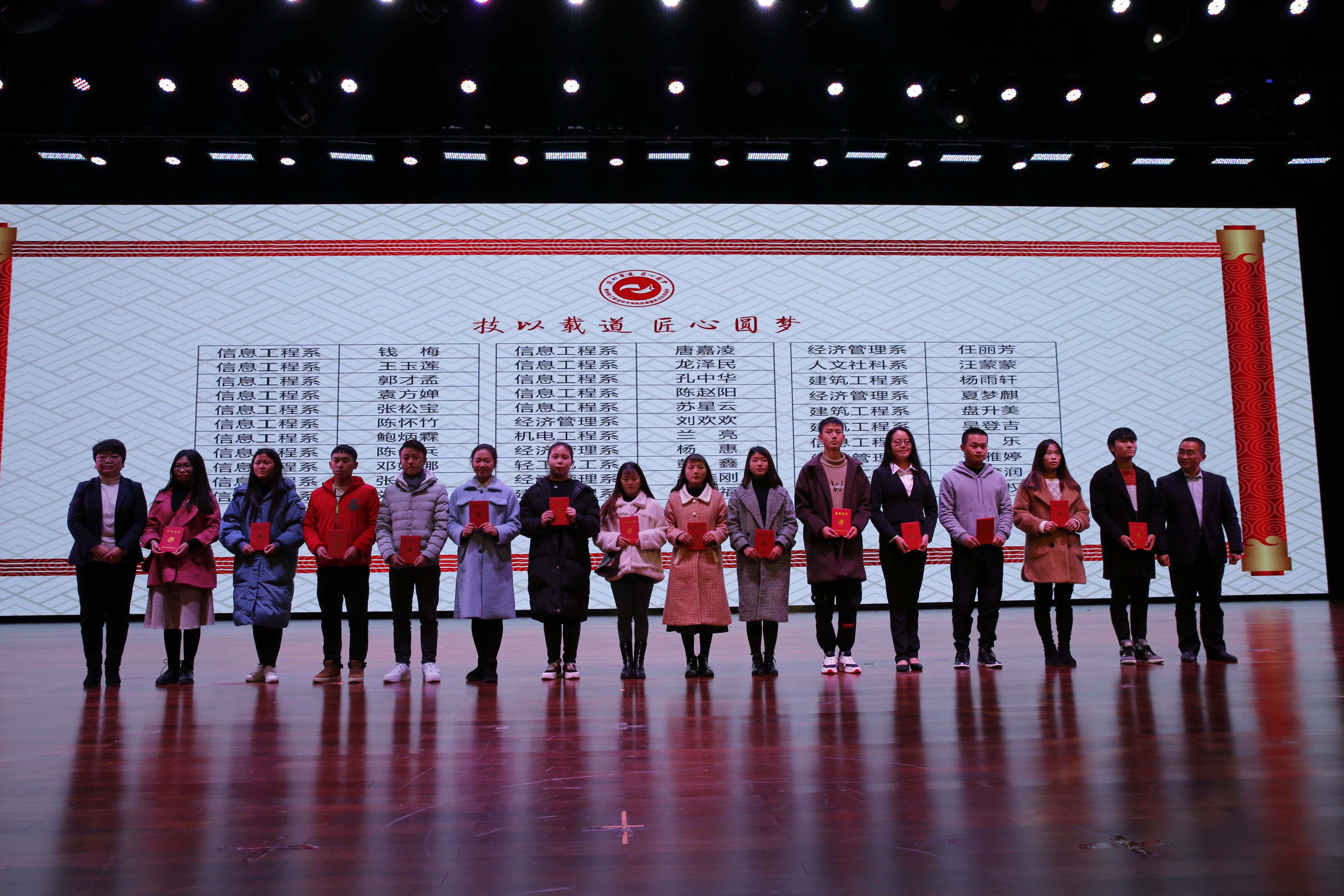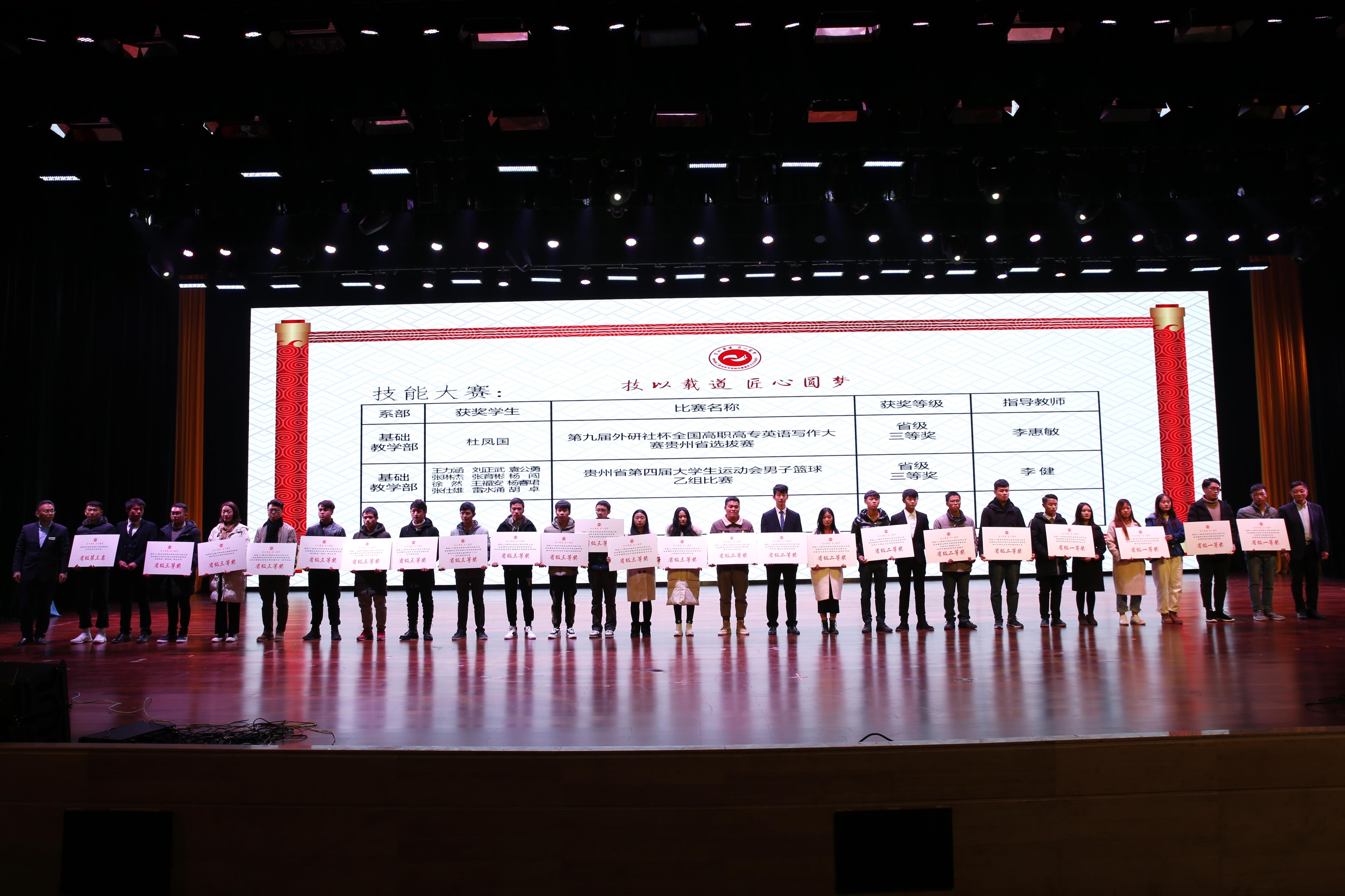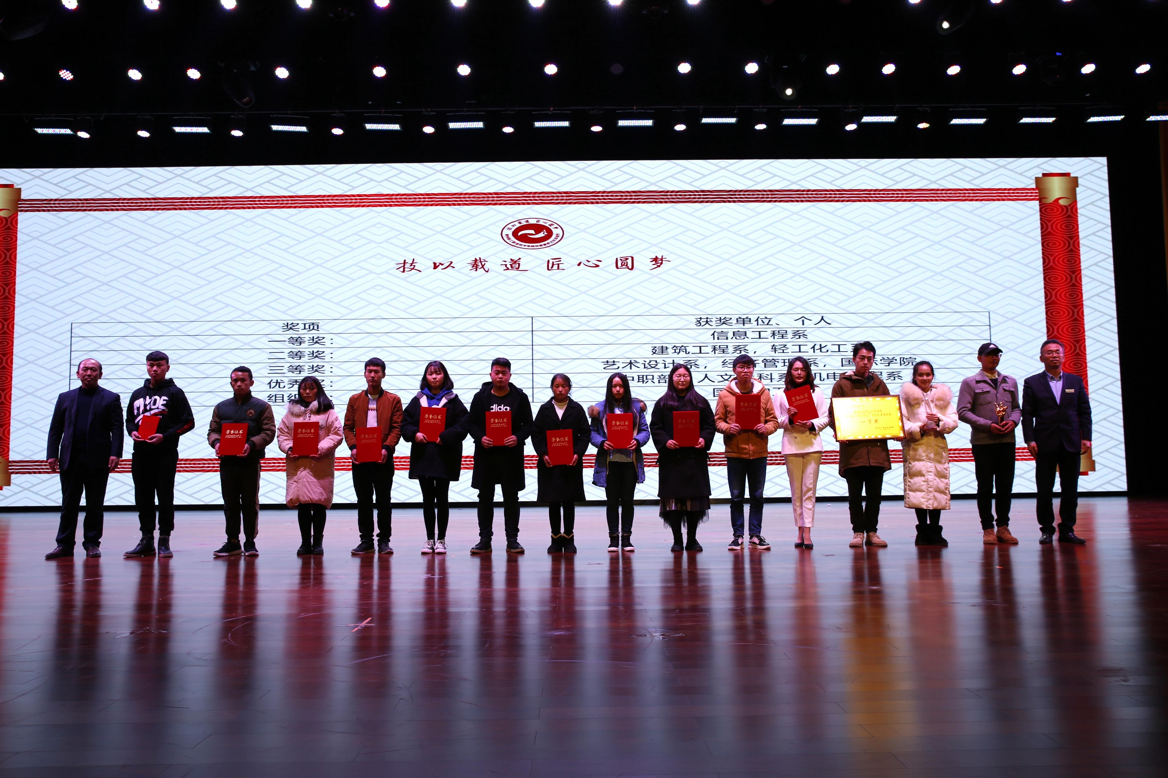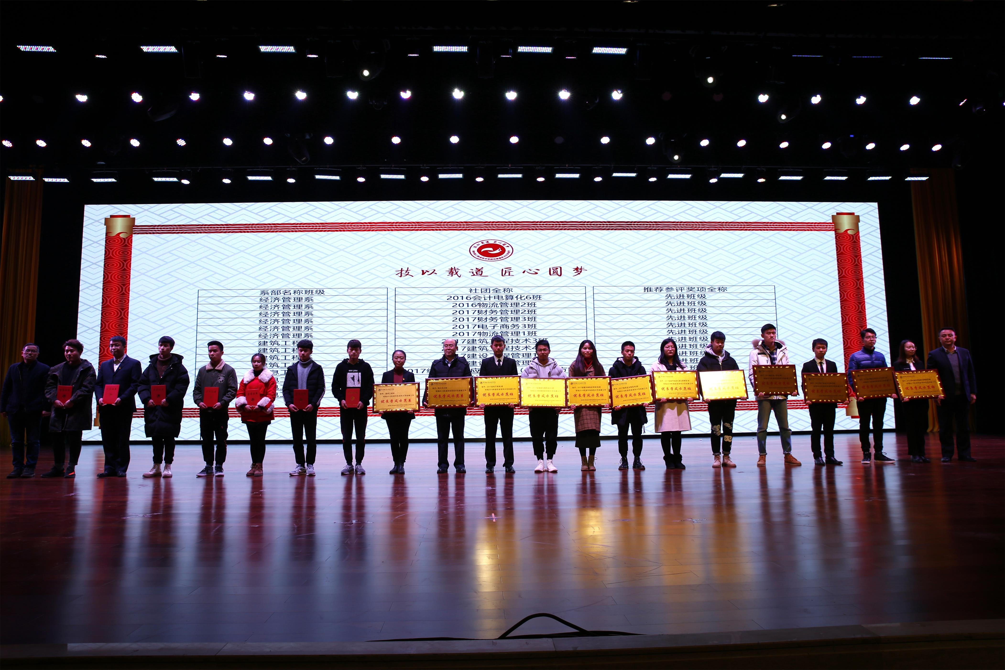 荣获国家级评优评先、省级评优评先、院级个人评优评先、院级集体评优评先、党的知识竞赛、“创业英雄”寻访活动、技能素养文化活动月之素养类、技能素养文化活动月之技能类(系部)、技能素养文化活动月之技能类(院级教师类)、技能素养文化活动月之技能类(院级学生类)、技能素养文化活动月之技能类(省级类)、技能素养文化活动月之技能类(国家类)等奖项的代表分批上台接受表彰,出席表彰大会的学院领导分别上台为获奖的集体和个人颁奖,颁奖过程中穿插进行了歌曲、舞蹈、诗朗诵等精彩的节目表演。