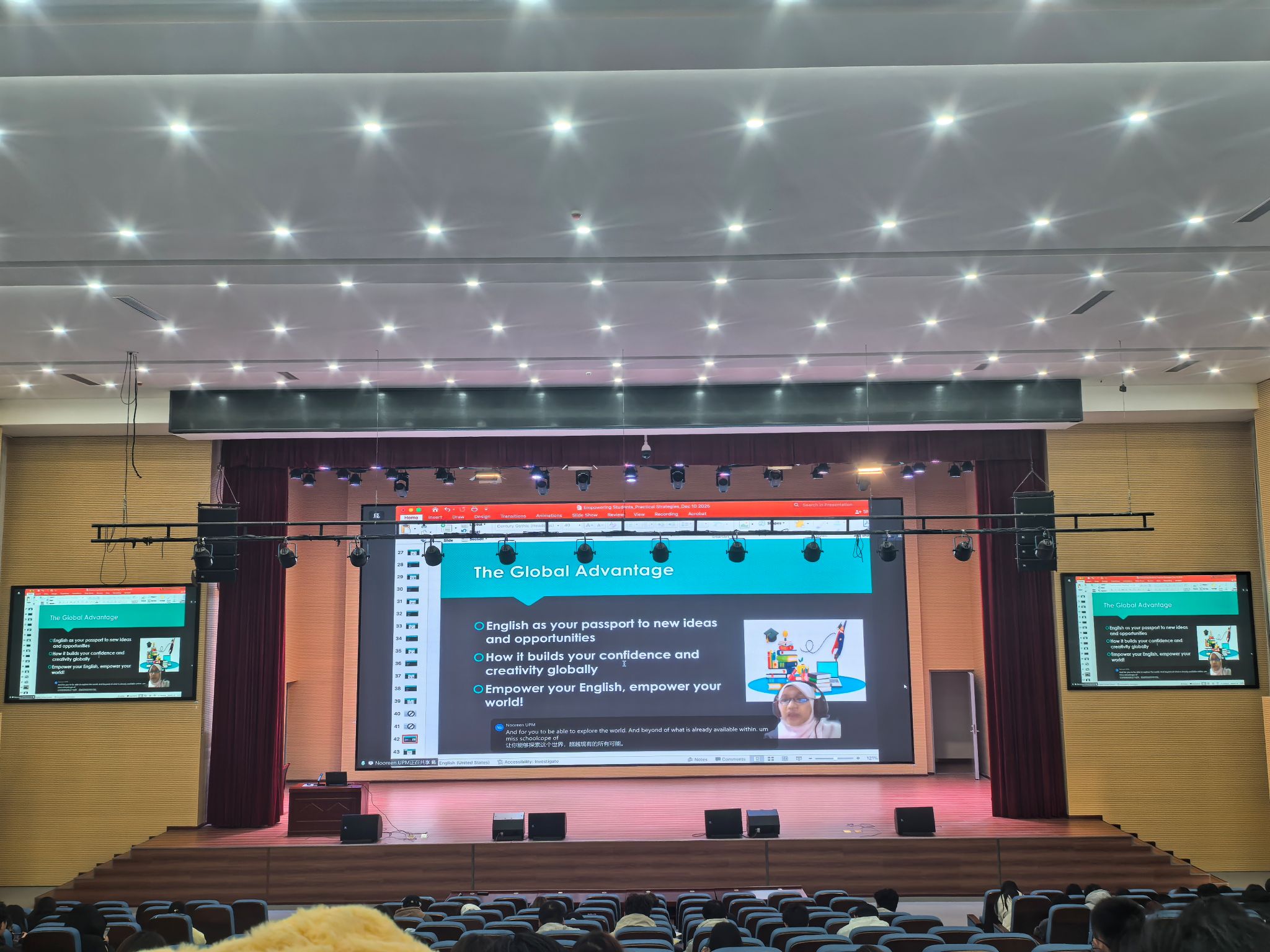 2025年12月18日,在崇匠楼112多功能报告厅顺利开展英语学习提升策略国际交流专题学生讲座。本次讲座由马来西亚博特拉大学副教授Nooreen Noordin 博士主讲,300余名师生齐聚一堂,共同参与学习。此次活动是我校国际化人才培养系列讲座的重要内容,通过跨文化交流对话,为学子们打开了全球化视野下的英语学习新维度。
