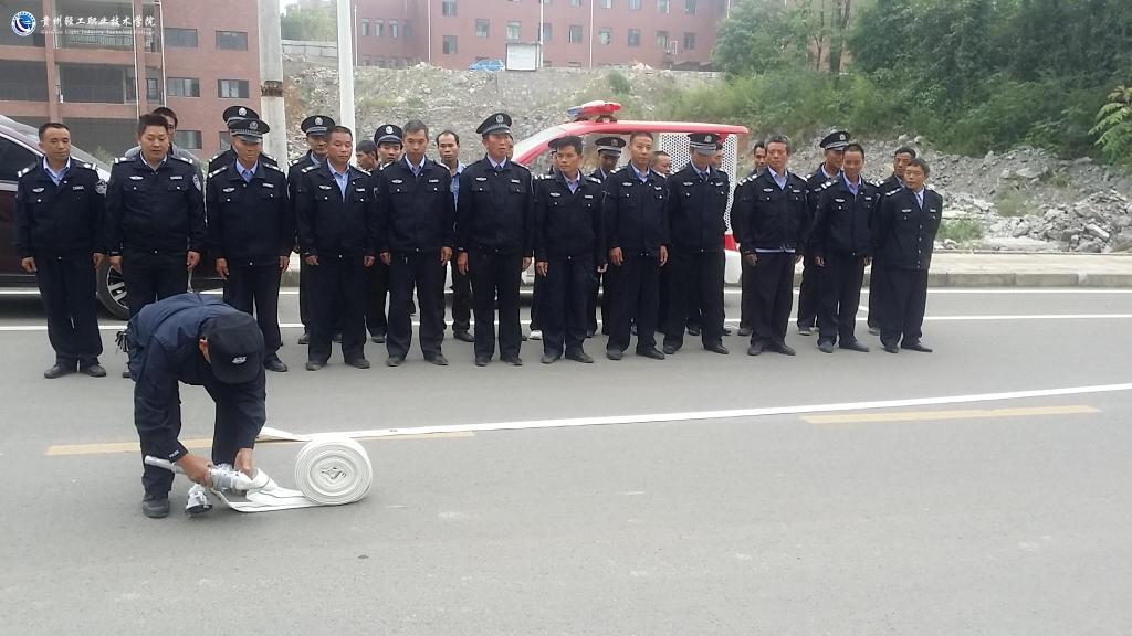 在演练中,保卫处消防科科长阮长河同志传达了花溪大学城高校消防安全专项会议精神,并对全院消防安全隐患排查情况做出通报。对保安公司及安保人员提出要求:第一、要正确掌握灭火器和消防水带的使用方法;第二、安保人员发现火情时要及时上报,并积极参与救援行动;第三、安保人员需全体加入贵州轻工职业技术学院义务消防队。