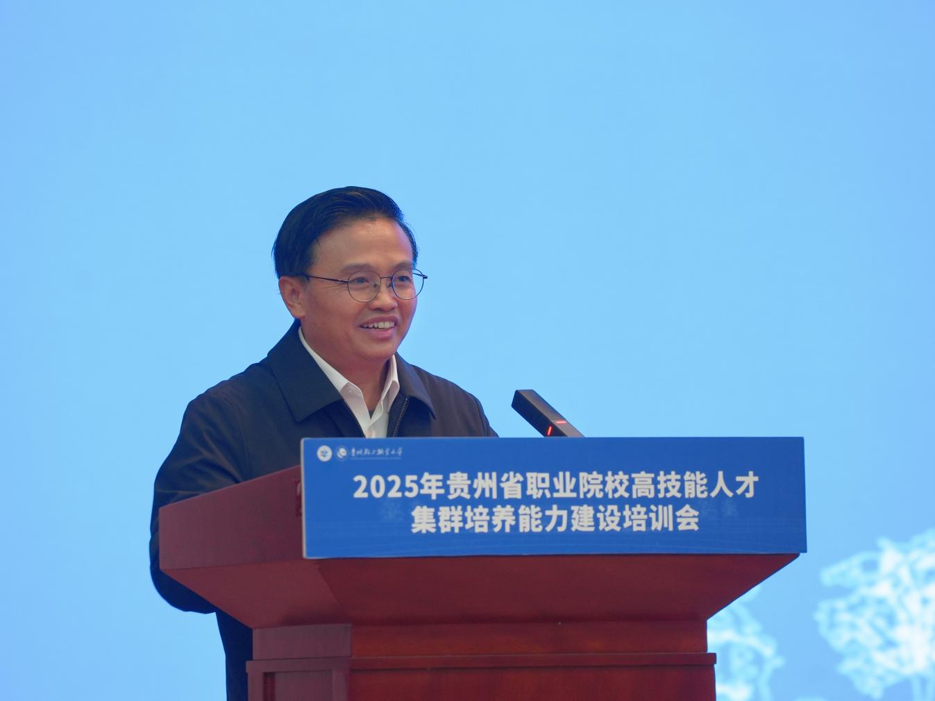 2025年10月24日,由贵州省教育厅指导,贵州省职业教育学会与贵州轻工职业大学联合主办的“2025年贵州省职业院校高技能人才集群培养能力建设培训会”在贵州轻工职业大学隆重举行。本次培训会旨在搭建高水平交流平台,凝聚发展共识,助力我省职业院校提升人才集群培养能力。来自全省43家单位的200余名职业院校领导、职能部门负责人、专业带头人及企业代表齐聚一堂,共谋高技能人才培养新篇章。