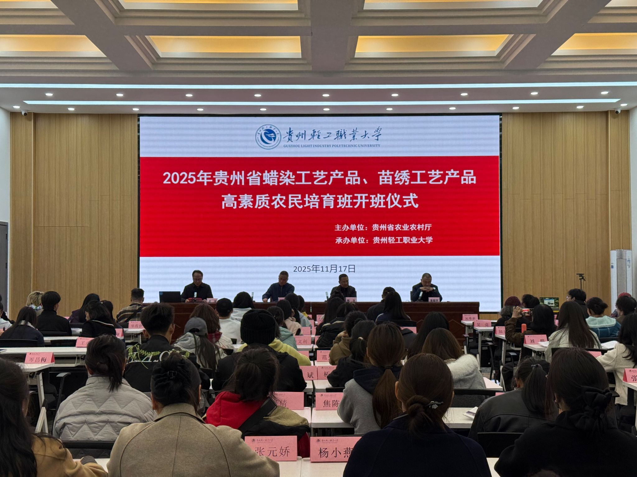 2025年11月17日下午,由贵州省农业农村厅主办、贵州轻工职业大学承办的“2025年贵州省蜡染工艺产品、苗绣工艺产品高素质农民培育班”开班仪式在贵州轻工职业大学骋怀楼一楼培训教室举行。本次培训聚焦蜡染与苗绣两大非物质文化遗产项目,旨在传承民族工艺,赋能乡村文化振兴,培育一批懂技艺、善经营、会管理的高素质农民,助力贵州特色产业发展。
