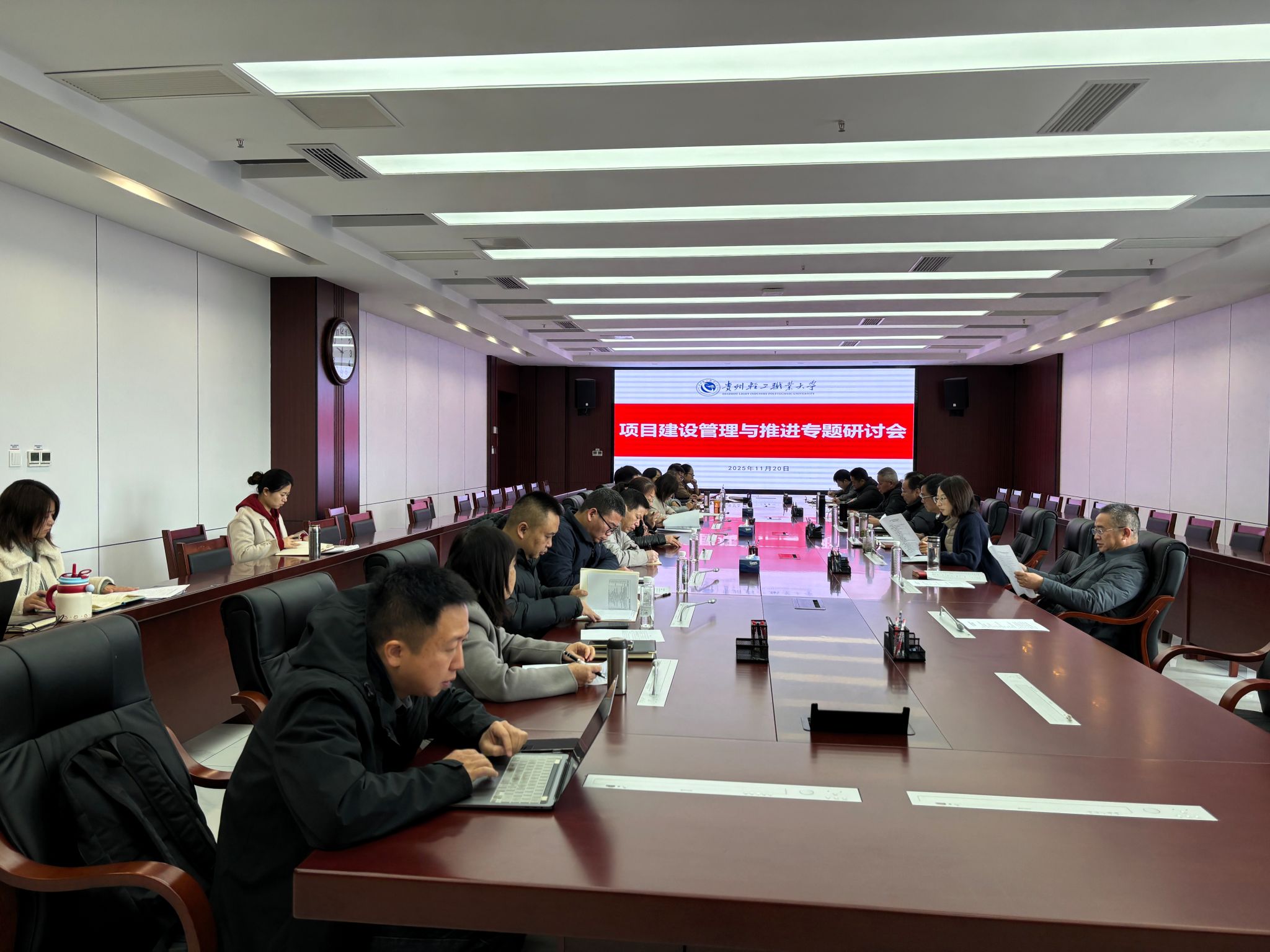 为破解项目建设堵点难点,规范管理流程,提升项目推进质效,2025年11月20日上午,贵州轻工职业大学在合一楼第一会议室召开项目建设管理与推进专题研讨会。学院党委书记张勇、院长杨天仪、纪委书记周炜、副院长何亚平、副院长孟永国出席会议,相关部门负责人、系部代表参加会议。会议由何亚平副院长主持。