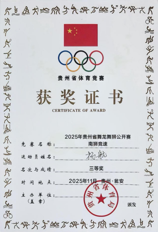 11月22日-23日,我校国旗护卫队(龙狮队)参加贵州省体育局举办的“2025年贵州省舞龙舞狮公开赛”,荣获南狮障碍项目一等奖、南狮传统项目二等奖、南狮竞速项目三等奖,获南狮团体项目第二名。