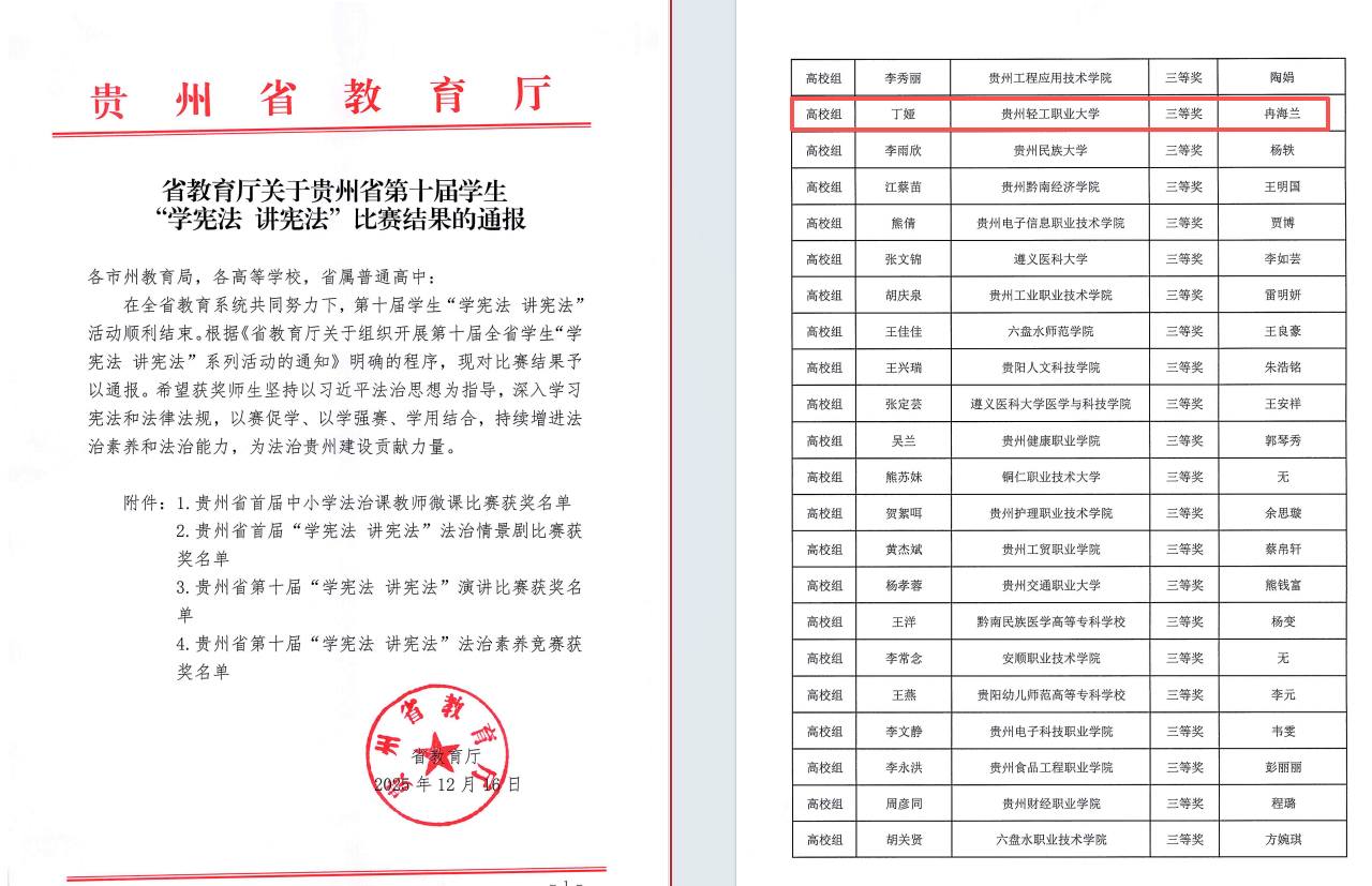 近日,由贵州省教育厅主办的第十届全省学生“学宪法 讲宪法”活动决赛在贵州工业职业技术学院落下帷幕。在备受关注的法治素养竞赛中,我校学生丁娅凭借扎实的宪法知识储备、清晰的逻辑思维与出色的现场发挥,脱颖而出,荣获高校组三等奖,充分展现了我校学子尊法、学法、守法、用法的良好精神风貌与扎实的综合素养。