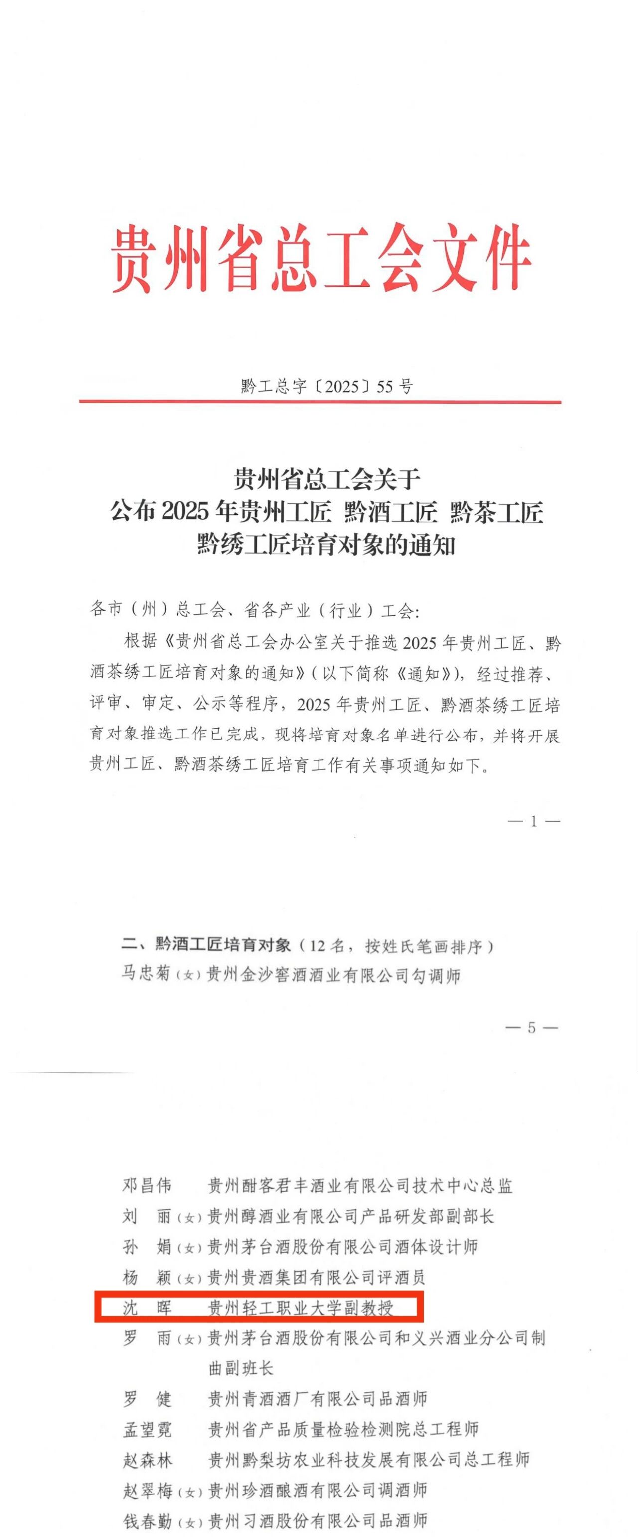 近日,贵州省总工会正式印发《关于公布2025年贵州工匠 黔酒工匠 黔茶工匠 黔绣工匠培育对象的通知》(黔工总字〔2025〕55号),学校工会积极组织开展推荐工作,经过层层选拔,轻工化工系沈晖老师成功入选黔酒工匠培育对象,成为全省12名黔酒工匠培育对象之一,这一荣誉不仅是对沈晖老师个人精湛技艺、工匠精神的高度认可,更是对学校深耕产教融合、赋能黔酒产业高质量发展成效的有力印证。