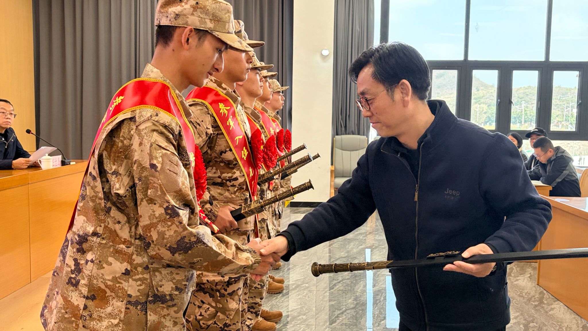 伴随着庄严雄壮的国歌,欢送会正式拉开帷幕。与会领导为入伍新兵代表颁发纪念品——“从戎之剑”。入伍新兵代表、建筑工程系学生王国毅同学发言,他深情感恩学校的悉心培养与师长的关心关爱,表达了投身军营、矢志报国的坚定决心与壮志豪情,展现了新时代贵轻大学子的责任与担当。