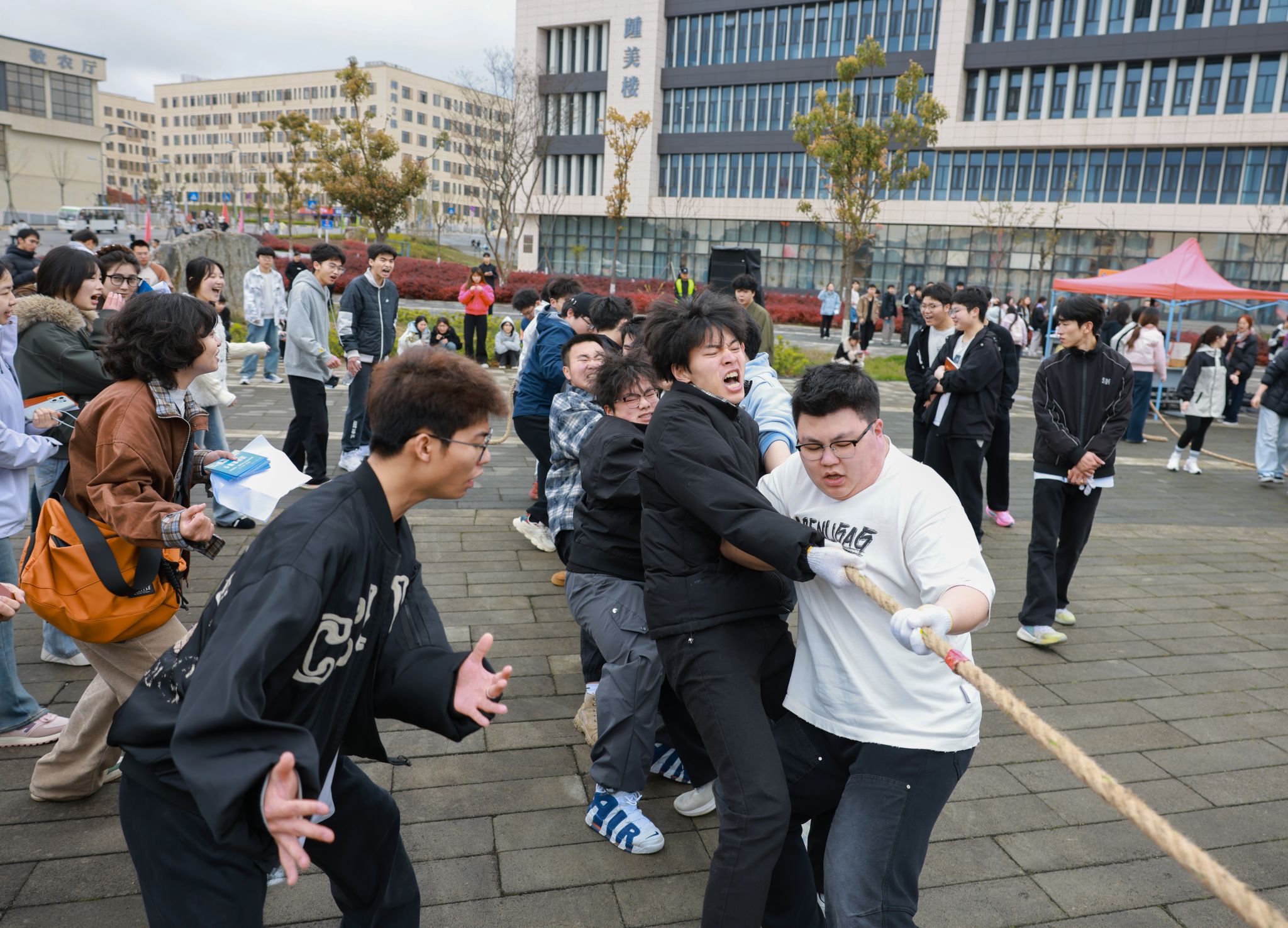 趣味活动现场更是精彩纷呈,团体项目与个人项目各有乐趣,处处洋溢着欢声笑语。拔河、趣味毛毛虫、袋鼠跳接力等团体项目中,各教学单位代表队默契配合、奋勇拼搏,参赛队员们凝心聚力、啦啦队的呐喊助威声此起彼伏,赛场上下连成一片,将团队协作的精神展现得淋漓尽致;套圈、小型保龄球、蛋跑、夹弹珠等个人项目趣味十足,吸引了众多师生参与,在轻松愉悦的氛围中体验运动乐趣。