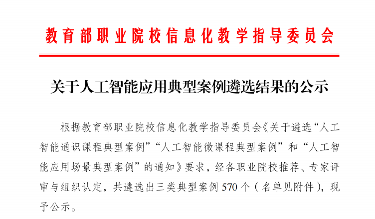 2026年3月30日,教育部职业院校信息化教学指导委员会公布《关于人工智能应用典型案例遴选结果的公示》,我校申报的《信息技术与人工智能》案例成功入选人工智能通识课程优秀典型案例,彰显了我校在人工智能通识教育领域的教学探索与实践成效。