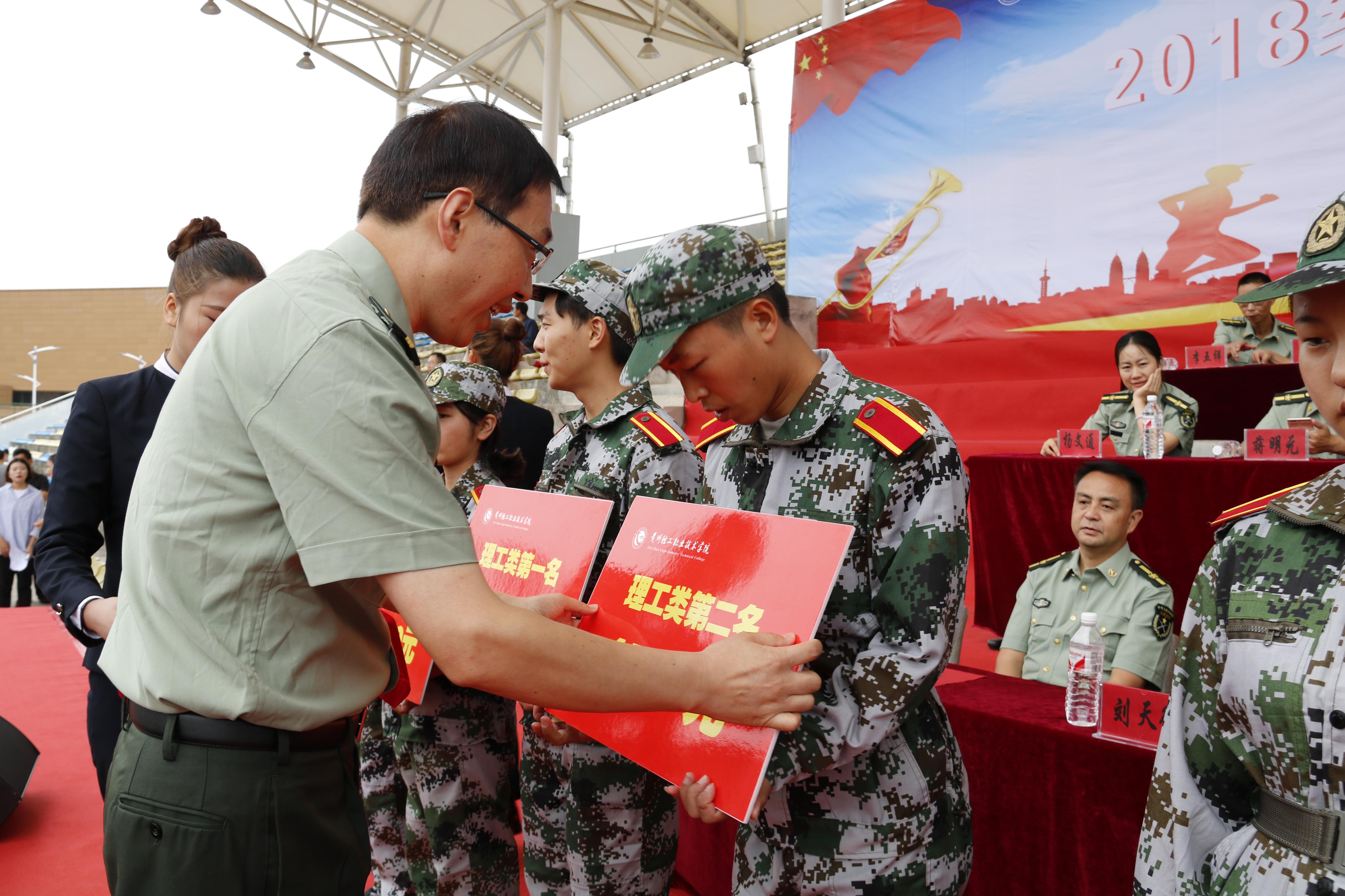 党委副书记冯其毅宣读2018级新生军训团组织机构名单,党委书记樊铁钢同志向军训团授旗。