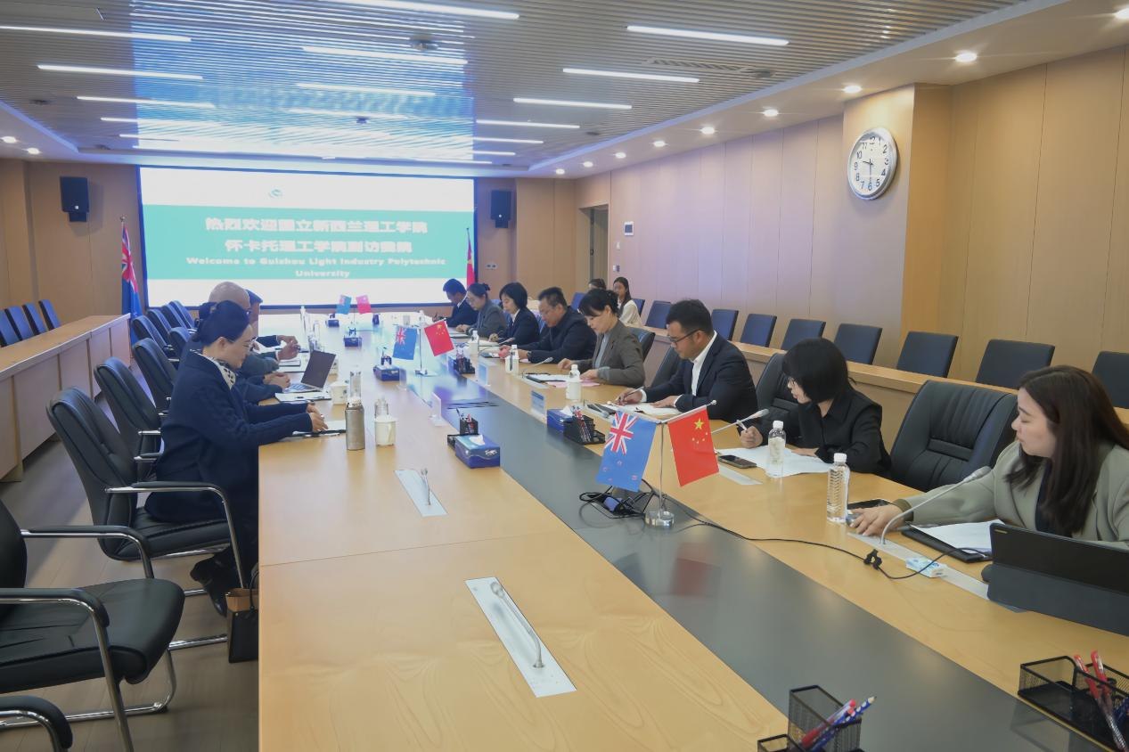 2025年10月27日,国立新西兰理工学院—怀卡托理工学院校长Warwick Pitts、国际总监Girish Nair、海外项目经理Mark Liu一行到访贵州轻工职业大学,双方在行政楼305会议室联合召开中外合作办学研讨会。党委书记张勇,怀卡托国际学院院长杨丽彦,副院长张嫒婷、杨远明以及教务处、招生就业指导办公室、怀卡托国际学院相关工作人员参加会议。会议由怀卡托国际学院院长杨丽彦主持。